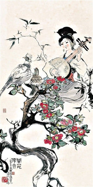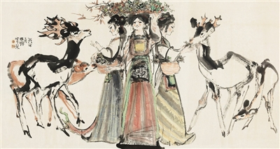 除了花鸟画外,程十发对于人物画也十分精通。尤其是少女,成为程十发绘画题材中的“??汀?。通常此类作品中身着民族服装的少女,笑容满面,画面充溢着云南少数民族普通生活的趣味。如程十发1979年作《荷塘少女》在2010年西泠拍卖中,以30.24万元成交;另一幅《少女与鹿》在西泠拍卖以56万元拍出。后一幅作品线条分明、摇曳多姿,鹿身上堆积的墨块显示出浑厚、古朴的效果,而少女身上多种色彩的搭配运用则显示出程十发高超的笔墨功力。