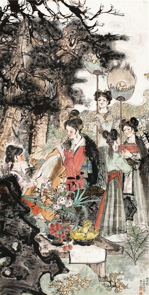 尤其值得一提的是,2014年香港佳士得拍出的程十发1979年作《补衮图》,估价仅为150-200万元,最后的成交价达 601万元。而此作早在上海嘉泰2005年春拍上,仅以286万元拍出,九年间竟翻了一番。该作一变以往画家大多写意的常貌,全用宋人双钩法,且汇山水、人物、花卉、鸟禽于一处,太湖山石爽朗劲利,参天松柏铁针苍虬,翠竹枯荣刚直精足,花墙清供细致入微,浮云青烟如铁线游丝,补衮五女神姿各异。