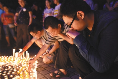 参加悼念的人几乎都带着蜡烛和鲜花,静静地排队,再将蜡烛围成一个越来越大的心形。现场还有人用小提琴演奏着《送别》、《送战友》等曲目。