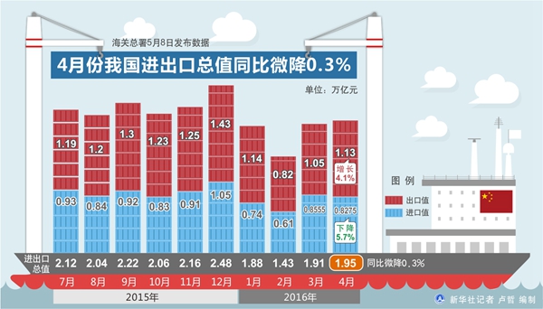海关总署8日发布数据,4月份我国进出口总值1.95万亿元,同比微降0.3%。其中,出口1.13万亿元,同比增速由上个月的18.7%回落至4.1%;当月进口8275亿元,降幅由3月份的-1.7%扩大至-5.7%。