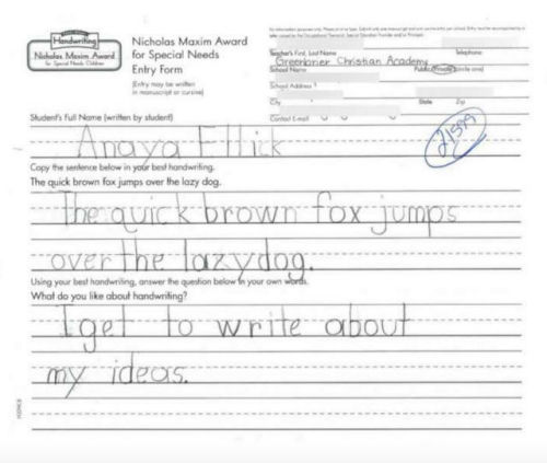 此外,同学们也不会因为艾丽卡的双手残障而用不同的方式对待她,而艾丽卡也十分乐观,她不认为双手残障是一个障碍。于是校长考克斯推荐艾丽卡去参加“Nicholas Maxim Special Award for Excellence in Manuscript Penmanship”的写字比赛,这个比赛开放给幼儿园到八年级的特教生参加。没有手的艾丽卡以半截前臂握着笔写字,艾丽卡的“作品”是一张请假条,名字为:“从学?;丶伊恕?。主办单位提到,当大家看着小女孩写字时,都很惊讶她怎么有办法写得这么工整,完全比的上一般用手指握笔的人们。