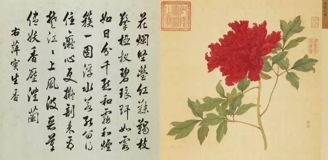 蒋廷锡百种牡丹谱 绢本册页(四册 蒋廷锡画、戴临书法各一百?。?/span>
