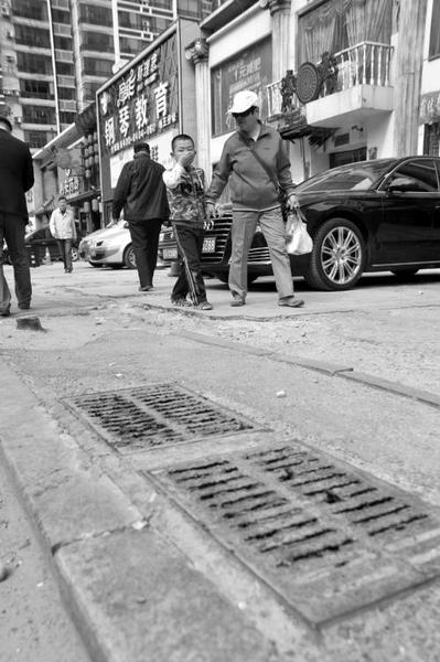学校正门对面的人行路上,两个长方形的井盖紧挨着马路边石。井盖乌黑,已经看不出本色,上面全是油垢,里面发出呼呼的风声,有些油垢甚至被吹到了井口上。井口附近有一股油烟味,记者靠近井盖时,头发被井里的风吹起,油烟味更加浓重刺鼻。