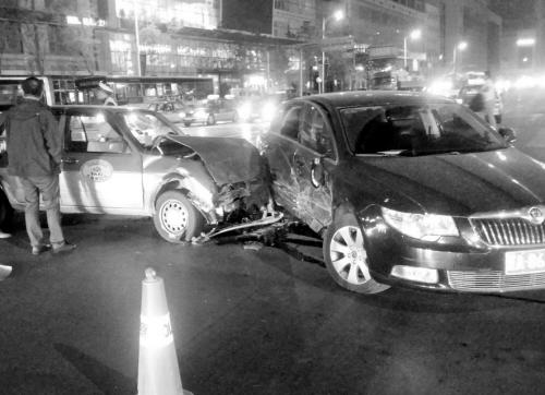 5月9日22时许,南京街与北二马路路口,李师傅所驾驶的出租车与一辆斯柯达轿车撞在了一起?!拔业笔笔怯杀毕蚰险P惺?,那辆轿车突然从东边冲了出来,我赶紧又踩刹车又打轮,可还是撞在了一起?!崩钍Ω盗⊥罚骸澳浅悼锰ⅰ坏澈斓?,速度还特别快?!?/p>