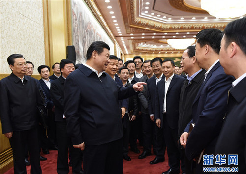 2015年1月12日,中共中央总书记、国家主席、中央军委主席习近平在北京主持召开座谈会,同中央党校第一期县委书记研修班学员进行座谈并发表重要讲话。这是座谈会后,习近平与研修班学员亲切交流。新华社记者 饶爱民 摄