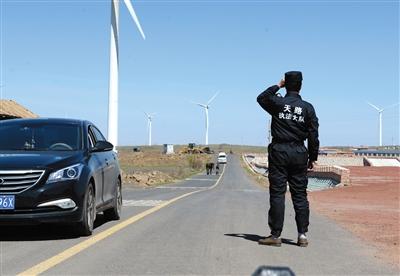 10日上午,张北草原天路服务中心,一名身穿“天路执法大队”字样服装的男子站在道路中间拦停路过车辆,告诉乘客需要按人头买票方可通过天路。新京报记者 吴江 摄
