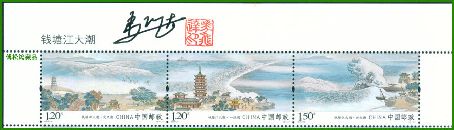 于2015年7月1日发行的《钱塘江大潮》全套3枚邮票连印,每枚规格为50毫米×30毫米,采用全景式构图的中国画散点透视手法和古代宫廷绘画技法,以翔实的地理资料和真实的活动场景为基础,从纵向的角度分别表现了“双龙相扑碰头潮”、“江横白练一线潮”和“惊涛裂岸回头潮”,展现了钱塘江大潮“一潮三看”的奇观?!肚两蟪薄酚势辈唤稣瓜至俗婀忝篮由?,同时体现了“猛进如潮”的时代精神,赞美了祖国多娇的江山,讴歌了中华民族坚韧不拔、勇往直前、追求美好的拼搏精神。该套邮票由马飞达设计,河南省邮电印刷厂采用胶雕套印的方式印制。完整细腻的布局、变化灵动的线条、生动的人物形象,在放大镜下别有意境。