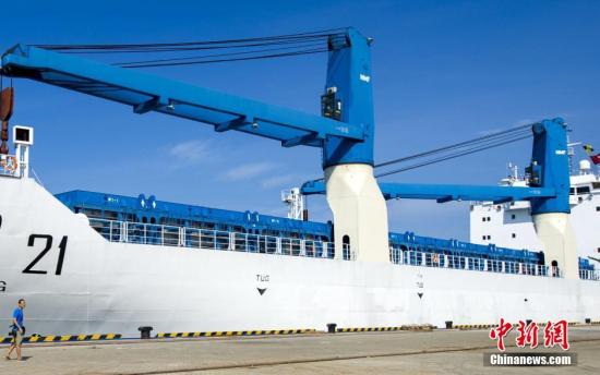 5月14日16时许,中国长征七号运载火箭安全抵达海南文昌清澜港。该火箭将被分段运至发射场区,按计划进行发射前各项测试准备工作,计划在6月下旬择机发射。据了解,5月8日,中国卫星海上测控部所属远望21号火箭运输船从天津港装船起航,途经渤海、黄海、东海、台湾海峡、南海等海域,安全抵达海南文昌,总航程近1700海里。图为承担运输中国长征七号运载火箭的远望21号火箭运输船停靠在海南文昌清澜港。中新社记者 骆云飞 摄