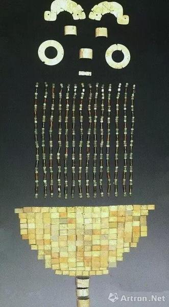 那么最早的玉衣是什么样子的呢?据研究,汉代的玉衣是由先秦时期的“缀玉面饰”演变而来的。所谓“缀玉面饰”,就是将做成眉、眼、鼻、口形状的玉石片,按一定形状排列,缀饰在织物上,于殓葬时覆盖在死者面部。这种缀玉面饰一般只有几十片玉片,还不是真正的玉衣,只能算是玉衣的雏形。最早的缀玉面饰出现在西周晚期的虢国墓地中,到了战国时期,缀玉面饰已成为一种颇为流行的丧葬礼俗,皇帝与贵族死后,都要用玉覆面做陪葬。后来,贵族们又从玉覆面中发展出了金缕玉衣等陪葬品。