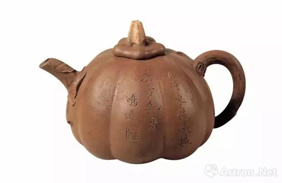 南瓜是一种外来的瓜果食材,传入中国甚早,常被中国人用来祝颂子孙生生不息,事业昌盛兴旺。宜兴地处江南鱼米之乡,物产丰富,因此紫砂常以此为题材。相较于其他清初紫砂器,陈鸣远的作品风格、特点及品类也有文字的记载,尤其是陈鸣远与曹廉让的合作,曹题铭文便是一条重要的线索。