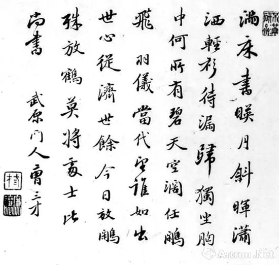 目前已知的基础样本有曹氏题跋(禹之鼎作《王士禛放鹇图卷》后幅题跋)、天鸡壶(天津博物馆藏)、合一壶(刊于《阳羡砂壶图考》)、其乐壶(刊于《荆溪紫砂器》1999年出版)。这四件标本经对比印证笔迹一致,均出自曹廉让手笔。