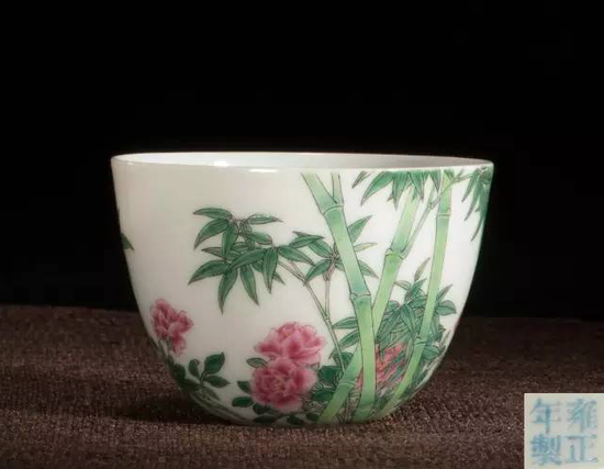 清雍正珐琅彩月季绿竹诗意小杯题诗:数枝荣艳足,长占四时春。钤“凤采”印。款识:“雍正年制”蓝料楷书款D 6.25 cmH 4.45 cm成交价:RMB 22,425,000