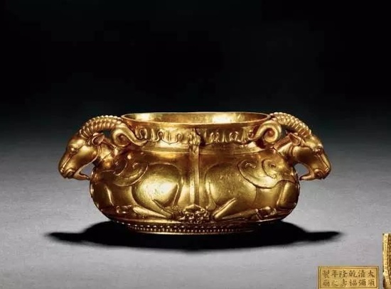 金质“大清乾隆年制 须弥福寿之庙”高浮雕双卧羊耳尊 D 19 cm H 7.5 cm G 1261 g 成交价:RMB 10,522,500