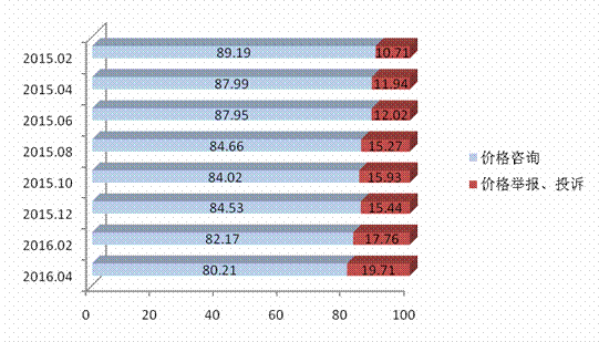数据显示,价格举报和价格投诉量占总举报量的权重进一步增加,2016年4月,价格咨询量占比达到平台开通以来最低的80.21%,相比最高值89.37%下降10.34%。这表明各级价格主管部门价格政策的宣传工作取得了一定成效,消费者维权意识进一步增强(详见图2)。