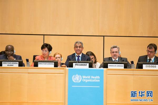 5月23日,在瑞士日内瓦万国宫,阿曼卫生大臣穆罕默德·赛迪(中)当选第69届世界卫生大会主席并主持大会。