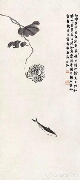 题识:乙卯冬十月 白石老人作于借山馆 天日晴和 时门前芙蓉正开 池鱼乐游 冬暖不独人喜也 客有观余作画者欲余为之记