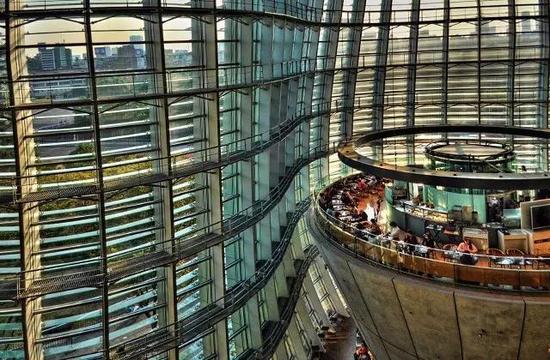 国立新美术馆位于六本木地区,于2007年1月开幕。馆体外观全部使用了玻璃材料,整体如波浪般延展而开,地上4层,地下1层的建筑可同时举行10个以上的展出,由日本著名建筑家黑川纪章设计,这也是他在美术馆界的收官之作。此外,馆内的圆锥塔也是格外引人注目。在巨大的逆锥体的最上面是可以休憩的咖啡厅,馆内的3楼则有厨艺泰斗保罗·博古斯掌勺的法国料理餐厅。