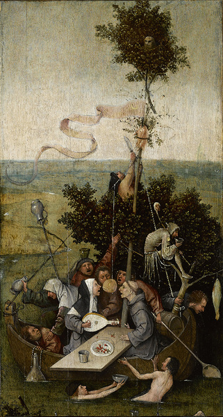 在画家的《愚人船》中,他将教士和修女安置在画面的核心位置,他们纵情欢歌,享用着水果美酒,丝毫不理会这艘孤舟将会何去何从。其余人物也都痴态尽显,各自肆意寻找快活。充当桅杆的,是一棵树,也许是神秘的树,知识的树,也是罪恶的树。一位愚人爬上树干,试图用刀把挂着的烧鸡拨下来。在树的顶端,有一只冷眼旁观的猫头鹰。画面上充斥着“酒鬼和饕餮之徒”,博斯的图像几乎是对勃兰特长诗的图解。
