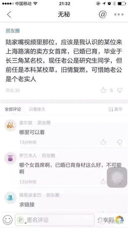 记者梳理相关网络信息发现,视频在网络上发酵后,有用户使用“无秘”软件发布消息,称视频中的女子系国内某知名证券公司证券分析师秦某,“已婚已育,毕业于长三角某名校,现任老公是研究生同学,但前任是本科某校草,旧情复燃,可惜她老公是个老实人?!?/p>