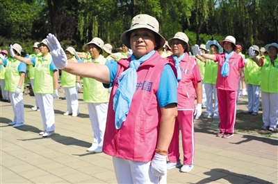 5月24日,数十名志愿者在大兴区亦庄博大公园为社区民众表演“控烟操”,做出控烟手势。新京报记者 吴江 摄