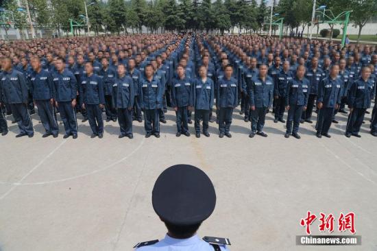 资料图:2015年4月28日,在河南省郑州市未成年犯管教所活动广场,1000余名未成年犯共同诵读《弟子规》等传统经典,他们列队整齐,抑扬顿挫。图片来源 CFP视觉中国