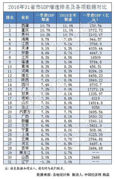 31省份一季度GDP排行出炉 东三省增速排名仍垫底