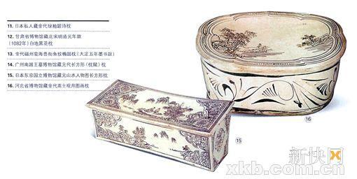 ■左图为日本东京国立博物馆藏元山水人物图长方形枕,右图为河北省博物馆藏金代高士观月图画枕