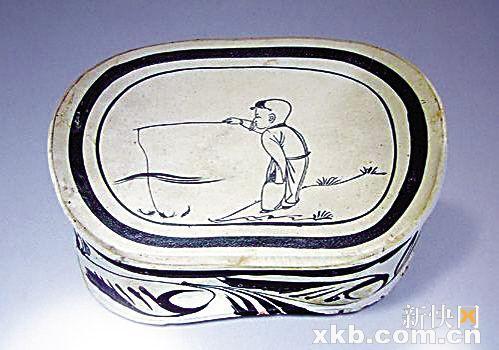 ■河北省博物馆藏金代白地黑绘童子钓鱼椭圆形画枕