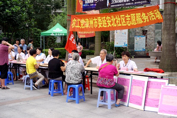 2016年5月27日,农工党漳州市委会组织农工党党员志愿服务队前往延安北社区开展志愿服务活动?;疃殖?,来自农工党漳州市中医院支部、芗城总支人民医院支部和科教支部的党员医生,现场为社区群众提供内科、骨科、神经科等方面的义诊咨询服务,认真诊断病情,详细解答疑问,给出治疗意见,并免费提供量血压等服务,吸引了100余名群众前来参加,受到广泛好评。