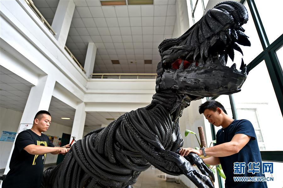 河南大学生用600条自行车轮胎造“恐龙”
