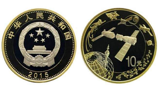 航天纪念币正面的图案中间依然还是以国徽为主元素,在它的上方是“中华人民共和国”字样,下方当然还是年号“2015”;纪念币的背面图案主图是神舟九号飞船在对接航天器的画面,在这画面的外围部分则是由东方红一号卫星、神舟五号飞船、嫦娥一号飞船、月球车等组成的图案,布局十分合理,同时又将我国这些年在航天领域取得的伟大成就都展现在了这小小的币面上。