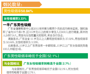 今天是世界无烟日,今年是《烟草控制框架公约》在中国生效满十周年。广东省健康教育中心调查发现,广东烟民不仅多,而且平均吸烟量大过全国平均水平——全省15岁及以上人群现在吸烟率为27.02%,男性为50.84%,女性为3.33%;广东烟民日均吸烟16.42支,高于2015年全国水平的15.2支。