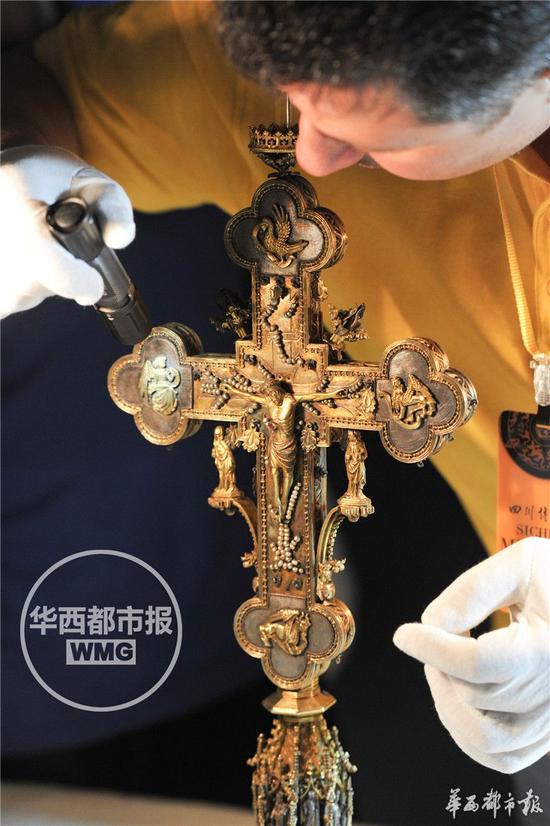 赵卿透露,文物清点工作需要“心细如发”,捕捉文物上新增的伤痕。他曾清点了一件镂空雕刻的十字架,再三检查,发现一根比针尖还细的柱子断了,比另一侧略短几毫米。他暗自庆幸,“万一点交时没发现这个瑕疵,撤展移交时才被对方察觉,责任就说不清楚了?!?/span>
