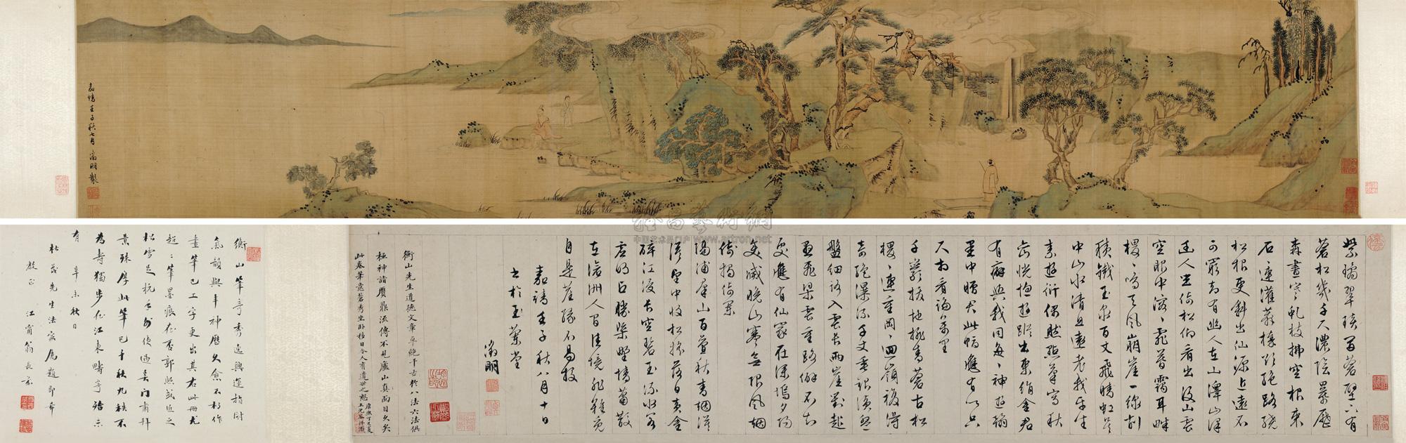 作为明代著名的书画家,很多人对文征明都不陌生,不过此次春拍推出的《书画合璧》手卷,因是文征明、文嘉父子合作的作品,又多了一重意义。作品中由时年85岁的文征明书写的《游西苑》,书法笔意老到,结构精研,气势恢宏,堪称文征明晚年行书的佳作。文嘉为文征明次子,精于鉴古,善画山水,笔法清劲。这幅作品的山水构图移步换景,徐徐展开,意境即显清远恬淡。