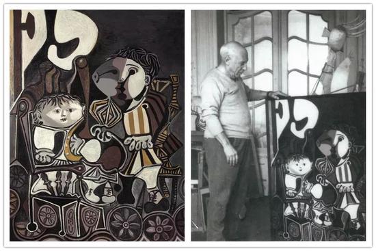 1950年创作的《两个小孩》 万达收藏(左) 毕加索自我欣赏他的《两个小孩》(右)