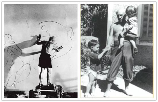 毕加索创作《和平鸽》(左) 毕加索和克劳德、帕洛玛在一起(右)