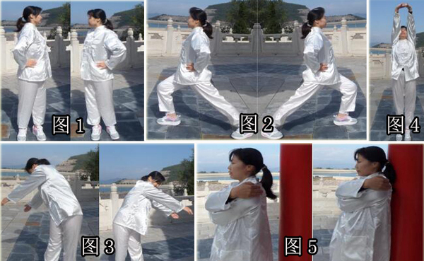 那么,如何早期发现颈椎病呢?韦以宗说,任何疾病的发生,都会有一段时期的亚健康状态。颈椎的亚健康最容易发现的就是颈椎旋转功能减退。椎曲正常与否,决定其旋转功能。正常人颈椎左右旋转有80度左右,也就是转动颈椎时,下巴可对上肩峰(如图1)。当你早上起来,做左右盼肩功时,一侧下巴对不上肩峰,表明你的颈曲已经出现问题。这时候,摸下你的左右锁骨,就会发现两侧高低不对称。出现这种亚健康状态及时练功。预防颈椎病最好的方法是“韦以宗颈椎十三功法”。十三功中最简单方便的是“左右盼肩功”(图1)、“弓步压腿功”(图2)、“甩手转腰功”(图3)、“顶天立地功”(图4)和“撞背振胸功”(图5)?!疚?世界中医药学会联合会脊柱健康专业委员会(筹)秘书处 王秀光 韦松德】