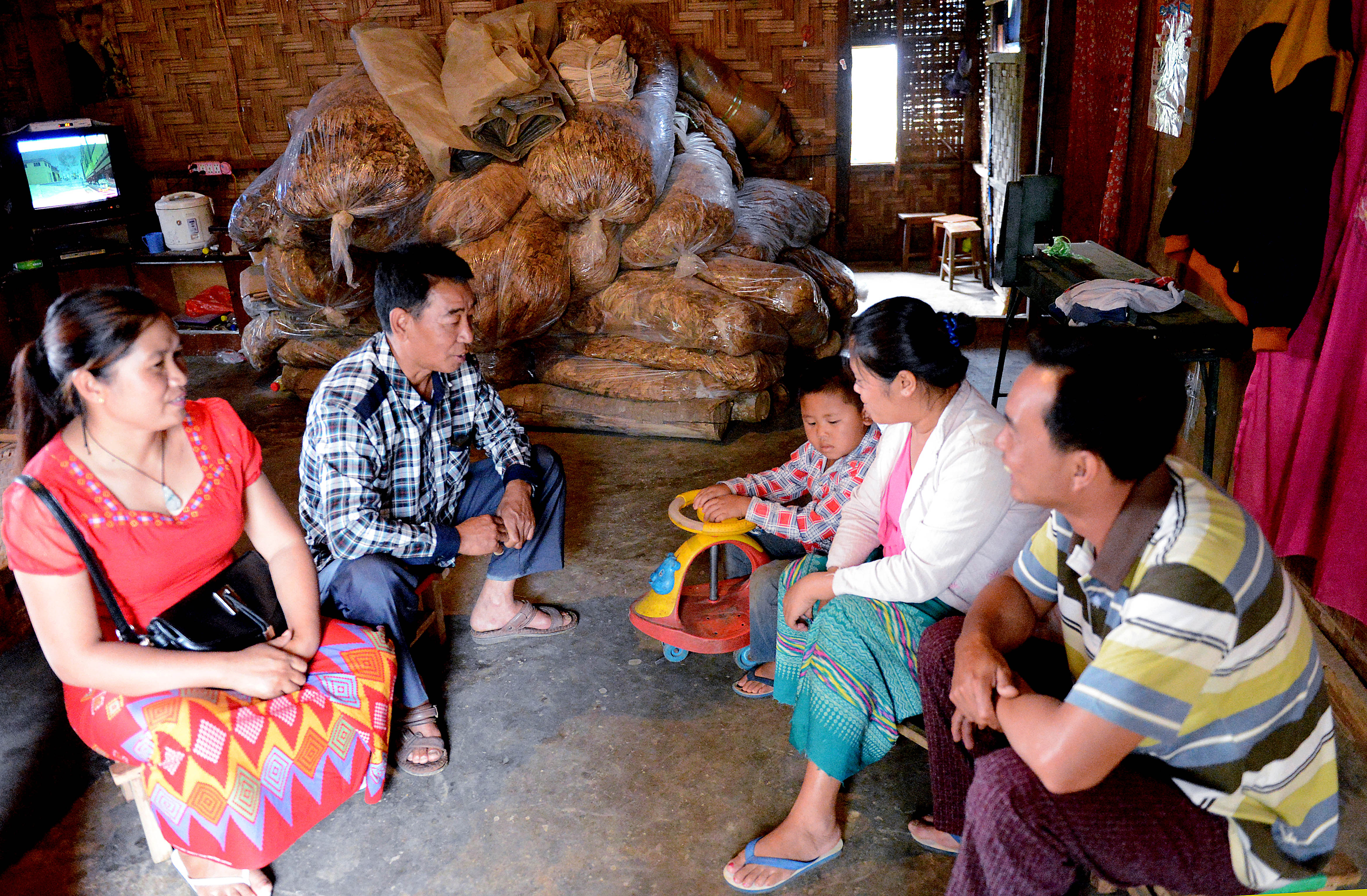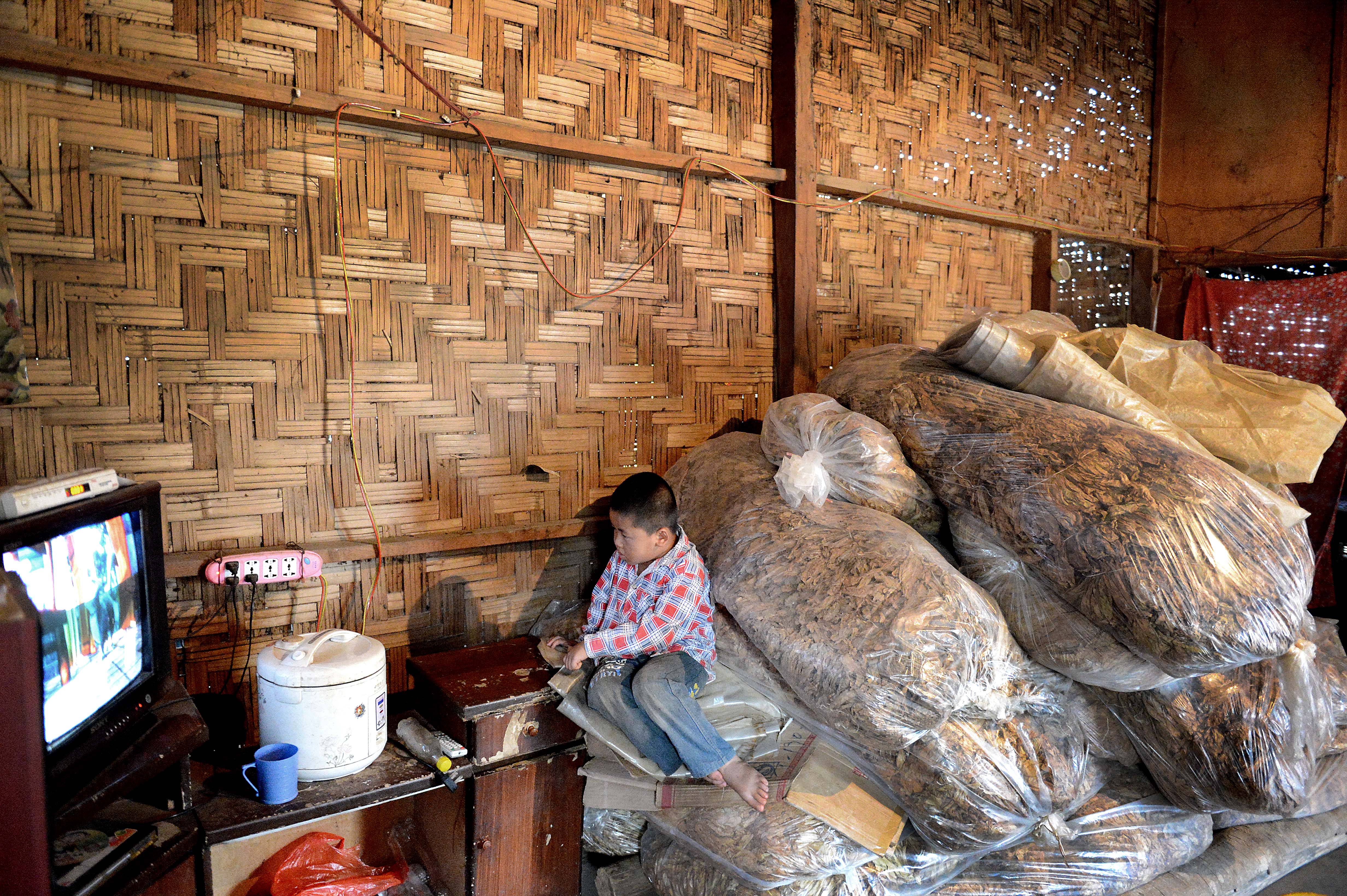 5岁的福瑞倚靠在烟草袋子垛成的烟草堆上,伸着脖子看墙角上一台21英寸老式电视机播放的动画片??吹接锌腿私?,便光着脚跑到妈妈的身后,抱着妈妈的腿偷偷地观察着陌生的客人。
