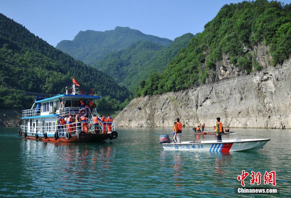 4日14时40分许,广元市轮船公司“双龙号”游船在途经利州区三堆镇飞凤村时,突遇强烈阵风发生翻覆沉没,船上共18人,4名获救人员中,1名小孩抢救无效罹难,其余14人下落不明。刘忠俊 摄