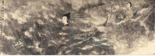 据北京保利国际拍卖有限公司官网资料显示,《云中君和大司命》由画家傅抱石于1954年创作。该作品高114cm、宽315cm,画中描绘了屈原《九歌》中的神话人物“云中君”和“大司命”?;魈馐队小霸浦芯痛笏久薄ⅰ耙痪盼逅哪昃旁戮萸褚胧孕?,傅抱石”。印文包括“抱石之印”与“踪迹大化”。