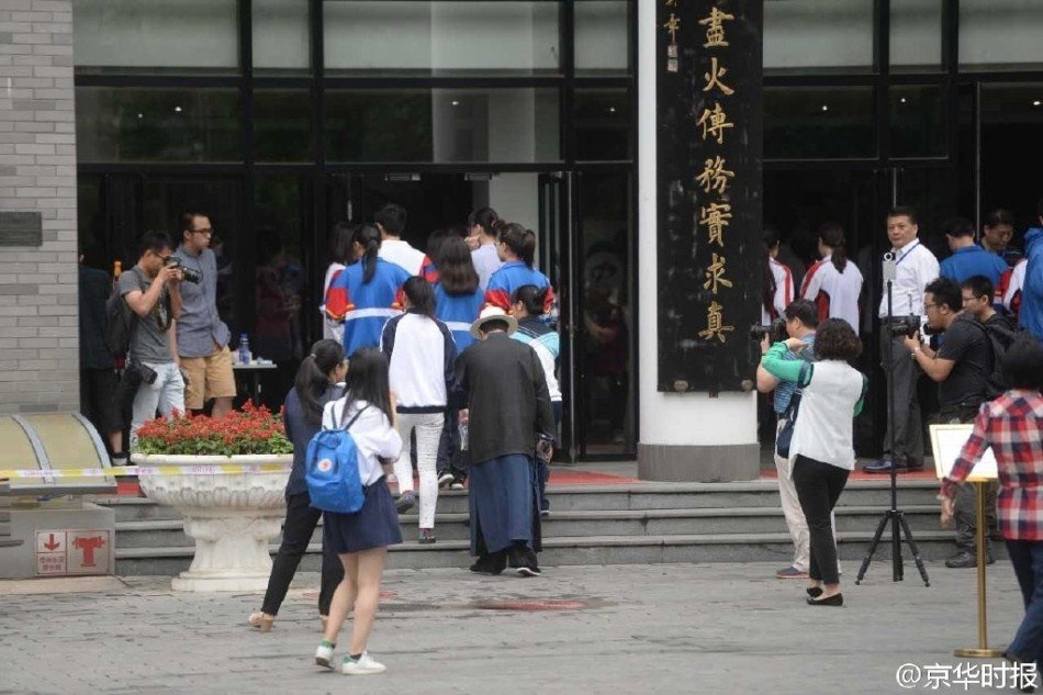 关键词:高考 北京考生 马褂 礼帽 进考场
