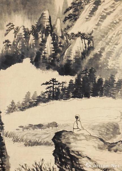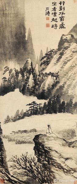石涛《坐看云起》水墨纸本?镜片连框?124×52 cm