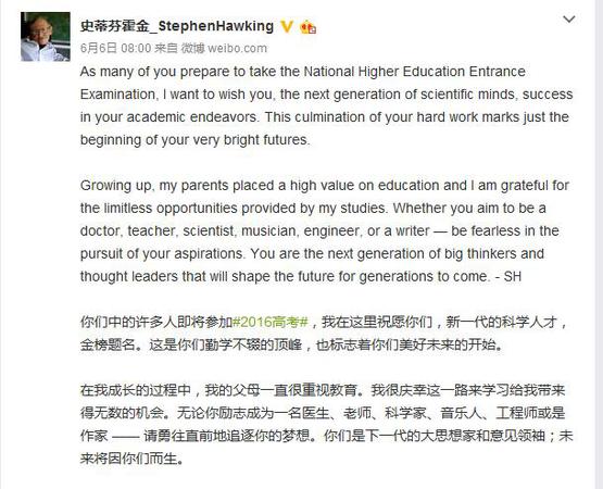 中国迎最严高考 霍金微博送祝福:未来将因你们而生
