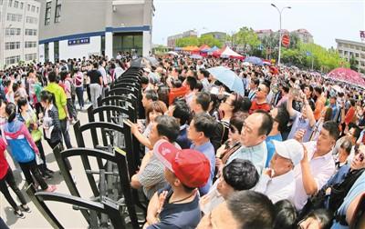 6月7日,在河北省秦皇岛市第三中学考点,家长等待首场科目考试结束后的考生走出考场。