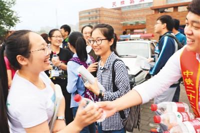 6月7日,天津武清中国铁建二十二局集团四公司爱心助考团小分队在考场外给考生和家长发放矿泉水。