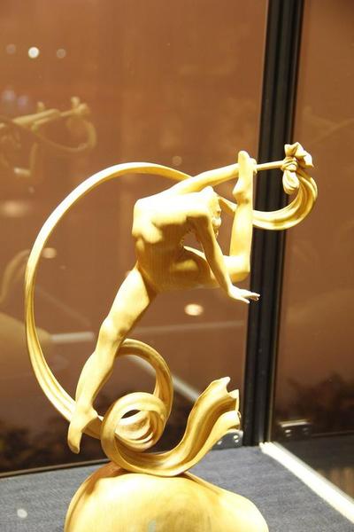 舞者曼妙的舞姿已经令人折服,肢体弯曲的肌理线条,都被虞金顺大师雕刻出来。丝带被舞起的瞬间,恰似飞天神女,动情而舞。