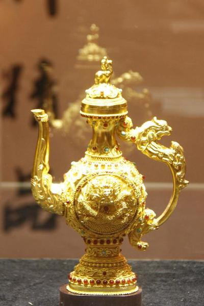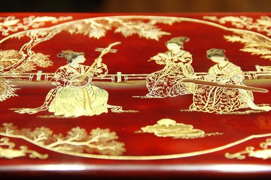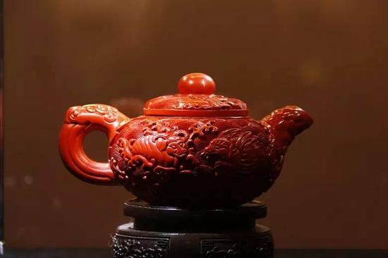 大漆与紫砂的结合,构图饱满,海兽生动,波纹形象。整个壶小巧精致华丽非常。