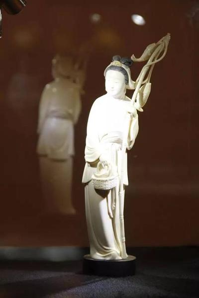 化作渔妇的观音其身光洁如玉,发丝雕刻十分细腻,服饰皱褶都清晰可见。