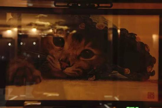 《喵喵》为双面绣,正反两面完全一模一样,憨态可掬形态,一双猫眼中充满灵气。