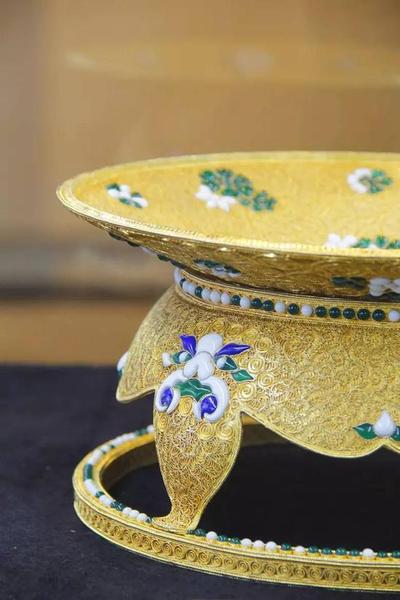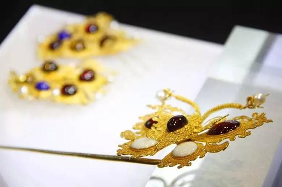 花丝镶嵌,燕京八绝之一,主要就是“丝”与“镶嵌”的艺术。以丝编结成型,再把珍珠宝石镶嵌进去,制成饰品。由此,花丝与宝石相得益彰。